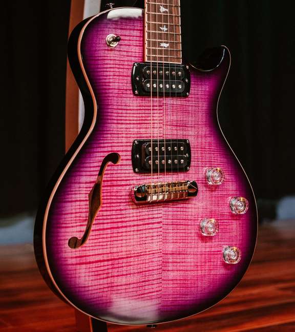 The SE Zach Myers is packed with features that will satisfy even the most demanding musicians. Featuring a chambered mahogany body with maple cap, flame maple veneer, and single f-hole, the SE Zach Myers provides smooth mid-range tones with a natural, resonant internal reverb. The resonance of the semi-hollow body paired with the smooth feel of the satin finish neck will make an immediate impression in your hands. Additional appointments to the SE Zach Myers signature model include a 22-fret, 24.594” scale length neck, PRS adjustable stoptail bridge, vintage-style tuners, and PRS-designed 245 “S” pickups paired with two volume and two tone controls and a 3-way toggle pickup switch. These pickups bring high-end clarity, low-end power, and an overall aggressive punch that maintains a certain sweetness.